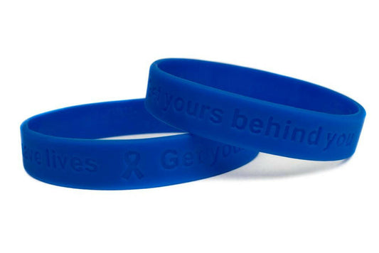 Colon Cancer Awareness is represented by the color blue. Choose below from our in stock selection of rubber wristbands, ribbon magnets, lapel pins and more or place a custom order to support Colon Cancer Awareness for your event or fundraiser.