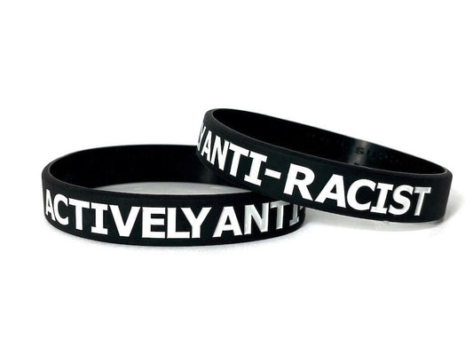 ACTIVELY ANTI-RACIST Black Rubber Bracelet Wristband White Letters - Adult 8"