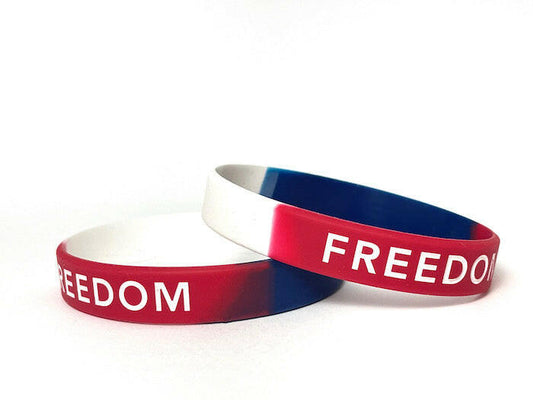 FREEDOM White Letters Rubber Bracelet Wristband – Red, White & Blue – Adult 8"