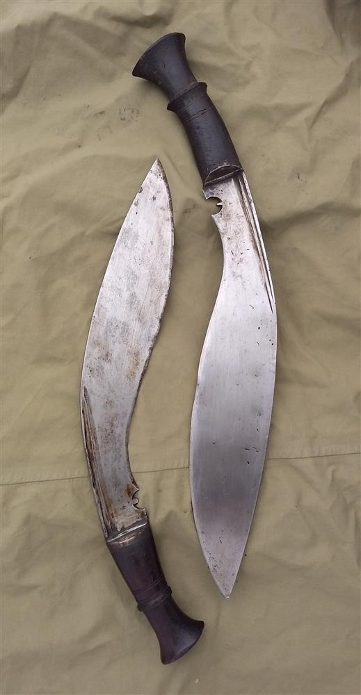 These kukris are genuine antiques. Think 1890 or earlier. Each of these was made carefully and skillfully by hand, the steel smelted, forged, shaped and hammered by an expert from the Nepalese Kami clan. These much loved classics have seen action with the Nepali military and the British Army. The BhojPure Traditional Kukri is approximately 17” long, 2-1/2" wide and 3/8" thick.