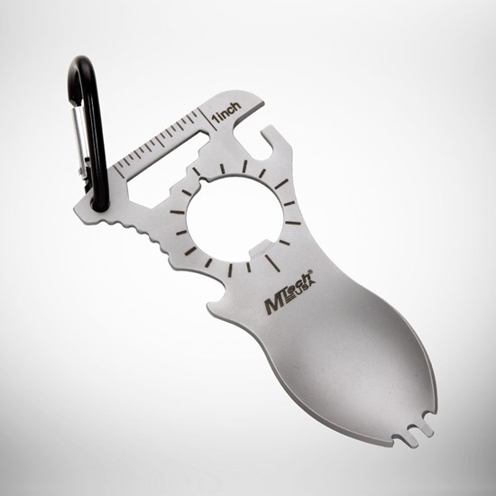 It''s true; great things can come in small packages! This one-piece of stainless steel is a bottle opener, can opener, spoon, fork and wrench in one, and on a carabiner for multiple carrying options none-the-less. Great for picnics, hiking, camping, car, almost anywhere the need for these tools arise.