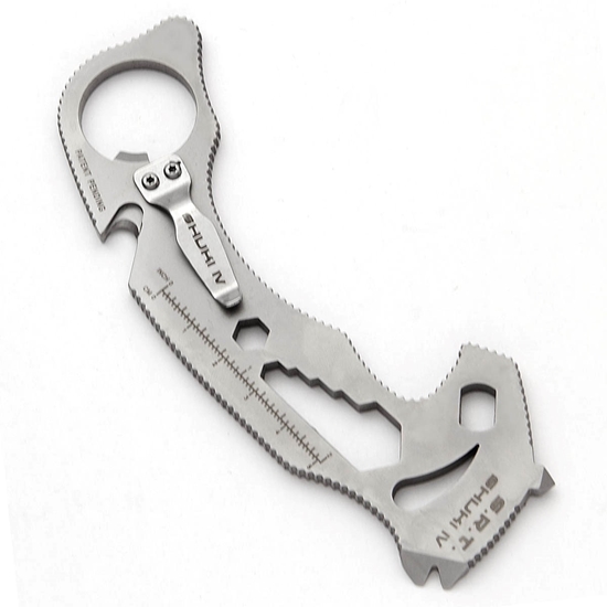 An incredible multi-tool for survival and rescue. The components allow for quick access to a variety of well-placed traditional tool options with design consideration for proper leverage and control, from opening a bottle cap to tightening a bolt. It’s great for quickly and easily accomplishing everyday tasks. You’ll want to take your new S.R.T. Shuki IV tool with you everywhere, so you can save the day, either by quickly completing a home project or by adeptly handling a more dire circumstance. Solid stainless steel. Silver or black.