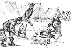 Soldiers often grouped themselves into a "mess" to combine and share rations, often with one soldier selected as cook or split duty between he and another man. But while on active campaign, rations were usually prepared by each man to the individual''s taste. It was considered important for the men to cook the meat ration as soon as it was issued, for it could be eaten cold if activity prevented cook fires. A common campaign dinner was salted pork sliced over hardtack with coffee boiled in tin cups that each man carried.