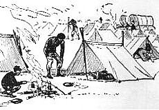 Army camps were like a huge bustling city of white canvas, sometimes obscured by smoke from hundreds of campfires. Camps were considered temporary throughout the year until the winter months when the armies would establish winter quarters. The soldiers would construct log huts that were large enough to accommodate several men, made of trees taken from any nearby source. The logs were laid out on stones underneath the bottom log, in a rectangle and notched to fit tight at the corners and stones, brick, or mud-covered logs were formed into a small fireplace in one end. Mud filled the gap between the logs and inside of the chimney over the fireplace. A roof made from tents or sawn boards and wooded bunks built inside finished the hut. Soldiers often named their winter huts after well known hotels or restaurants back home such as "Wiltshire Hotel" or "Madigan''s Oyster House". The armies quartered in these small huts through the winter months and then it was back to the field and dog tents.