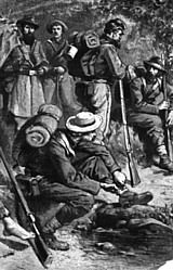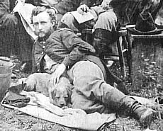 Despite orders to the contrary, many soldiers kept pets with them including dogs, cats, squirrels, raccoons, and other wildlife. One regiment from Wisconsin even had a pet eagle that was carried on its own perch next to the regimental flags. General Lee was purported to have had a pet chicken that faithfully delivered a fresh egg for the general everyday. By far the most popular pets appears to have been dogs and their presence with a master in camp or on the march was often overlooked by high commanders. Many officers, including General George Armstrong Custer (above) who kept a number of dogs around his headquarters, favored the hardiness of these loyal companions and their companionship was, as one soldier put it, a "soothing connection" with home. Both the 11th Pennsylvania Infantry and the 1st Maryland Infantry (CSA) had singular dogs that followed the men through the most difficult campaigns including Gettysburg. Sallie, the 11th Pennsylvania''s unofficial mascot, is remembered in a bronze likeness on the regimental monument at Gettysburg and symoblized there for its loyalty to the dead of the regiment. The canine that accompanied the 1st Maryland was regrettably killed in action on July 3 at Culp''s Hill, after having participated in the charge of the regiment. So struck by the animal''s gallantry and loyalty to its human companions, a Union officer ordered the animal be given a proper burial alongside the dead of 1st Maryland.